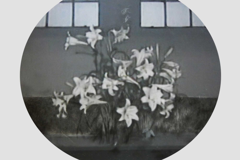 資深藝術家艾馬琼珠的作品多與社會與歷史產生對話。展出的作品《百合花,凝望》的圖像來源於森田荒光執導的經典日本電影《其後》。藝術家擷取電影的其中一個鏡頭打印,繼而重新素描畫面,素描的過程中讓藝術家有更多時間細嚼電影的意味,並透過自己的筆觸改變那些靜止的時間,也讓畫家擁有重寫歷史的機會。