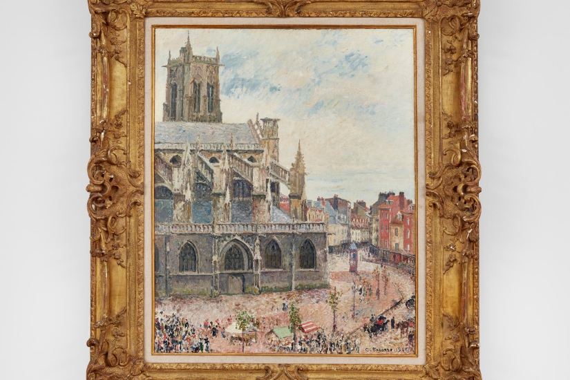 卡米耶·畢沙羅的《聖雅克教堂》展示於保羅·塞尚的作品對面,而此編排其實也別具含義。這位法國印象派大師是保羅·塞尚的老師,他在印象派風格上也為他的學生帶來不少啟發。畢沙羅本來就很欣賞勞德·莫奈創作於1890年代的「魯昂大教堂」系列,但當他也在創作教堂的時候,同樣獎諾曼底聖雅克教堂的扶璧和塔樓轉化為斑駁筆觸,當卻增加了城鎮集市日的攤位和熙熙攘攘的人群,使得構圖更為豐富。