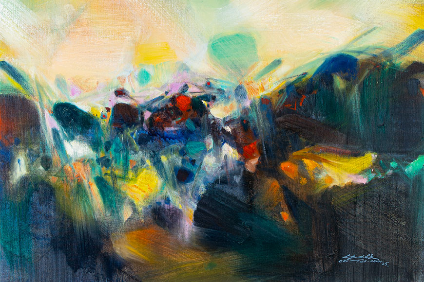 朱德群曾在書法上的受過正統訓練,草書筆法早已練得爐火純青,後來又師承現代水墨畫大師潘天壽學習水墨畫,種種經驗啟發了他後來的抽象風格之路。他作品題材多以古典畫作和詩歌作主題,筆下的色塊和幾何線條,流露抽象表現主義的氛圍。將傳統的中國藝術風格和西方現代主義融為一體,更造就了別樹一幟的東方抽象風格。