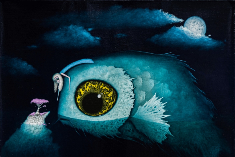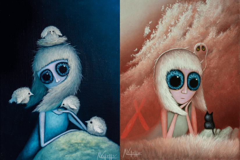 Vilella 以超現實主義的⾃動性技法創作,他表示每件作品都是從他的潛意識中浮現,那些樣貌趣緻的小精靈都是在沒有任何草稿或事先構思主題的情況下而誕生。這些標誌性的⼤眼⾓⾊並未展示笑容,卻在夜幕低垂中帶我們帶來光芒,讓人感到溫暖。在月光的照耀下,畫面充滿戲劇性的氛圍,讓觀眾不自覺地投入其中那個詩意的世界。