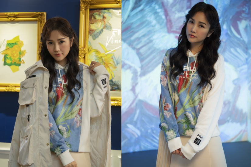 謝安琪 Kay 穿上是次系列,以運動風衛衣配襯拼接材質長裙,走進限定展覽陶醉於光雕投影和梵高名畫當中,完美演繹「Impressive Elegance」的主題。