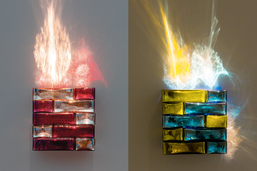在今次展覽中,Othoniel 展示了兩個系列的標誌性作品。其中一個便是「玻璃磚牆」,他與印度玻璃師合製的《珍石牆》(Precious Stonewall)雕塑系列,由不同尺寸和顏色的玻璃磚排列而成,創造出目不暇給的靜態畫面,展現一股嚴謹並井然有序的姿態。這些極具詩意的磚塊作品按照幾何形狀無限延伸的特性,以極簡的方式進行排列,美感背後,也隱含著藝術家對歷史或社會政治角力的感悟。