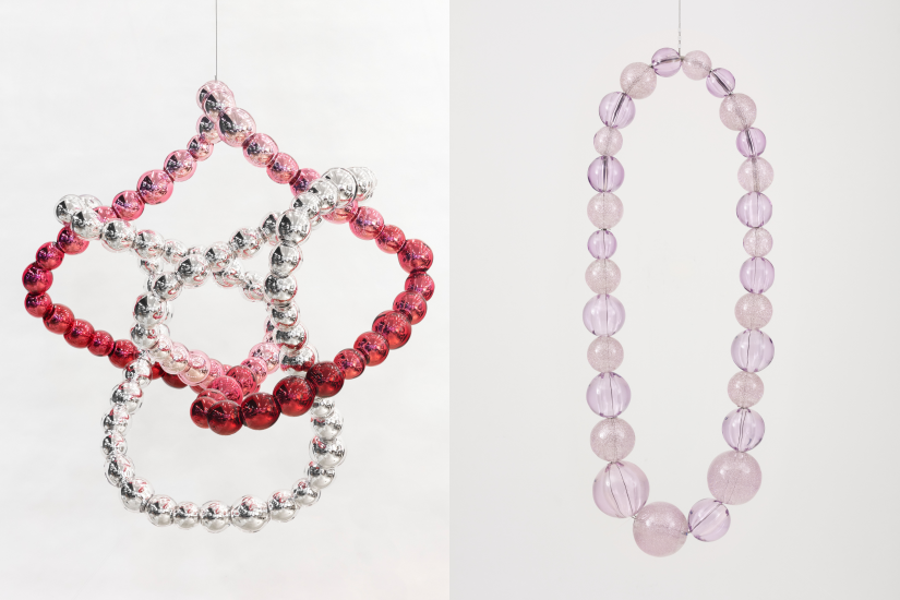 右:Jean-Michel Othoniel 《項鍊(粉紅雲母)》2021 粉紅雲母穆拉諾玻璃、不鏽鋼