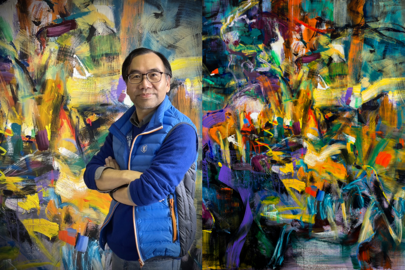 至於什麼是「爵式山水」?陳偉邦通常不照本宣科,無論筆觸速度、用色、構圖和佈局都變化不定,就如爵士樂活潑放任的「自由精神」,因而他的抽象山水畫中滲透著自由的生命能量。