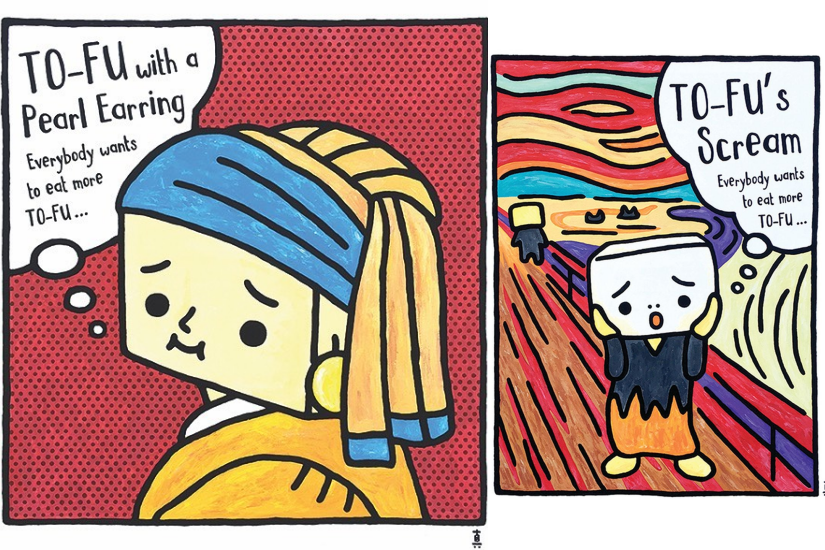 今次展覽展出 31 幅全新創作,其中 20 幅是豆腐家族的原版畫。在惡搞系列中,To-Fu 借鑒世界名畫《吶喊》和《戴珍珠耳環的女孩》的造型,創作出《To-Fu’s Scream》和《To-Fu with a Earring》等二創作品,並配上「所有人都想吃豆腐」的幽默字句,讓人看到會心一笑。