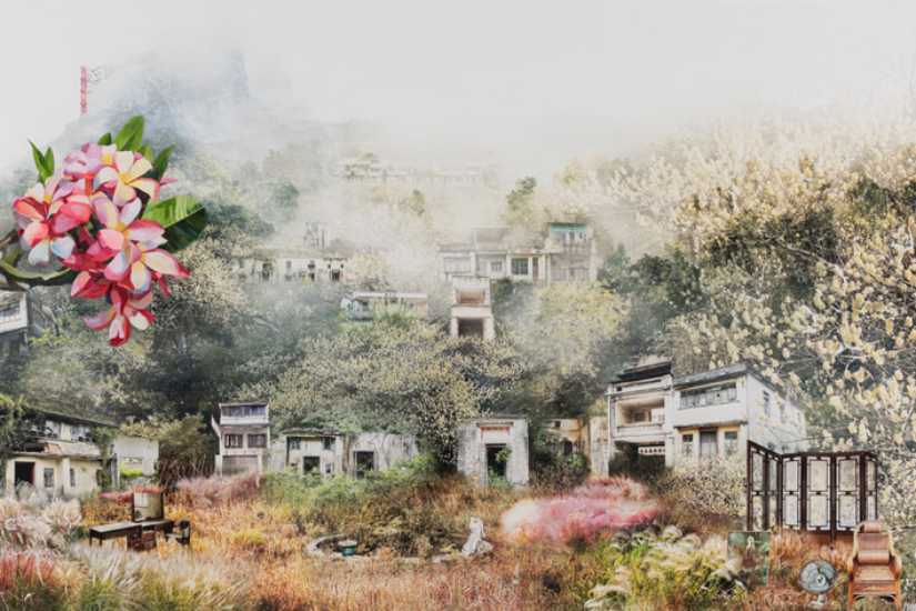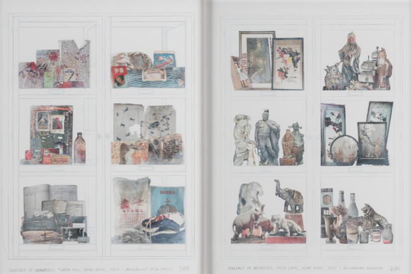 《Chimerical Villages》系列混合媒體作品超越了僻靜的場景本身,加劇了景觀的不可能性,將當代香港轉化為虛幻的影像。另一系列《Cabinet of Memories》由混合媒體紙本及錄像作品組成,展示了藝術家在廢棄場域所發現的物件和文物。這些 當代藏珍閣見證了香港過去十載的傳統生活方式,包含了來自學校、下舖上居的唐樓、住宅和工業結構等特定場域的故事與歷史,成了珍貴的歷史見證。