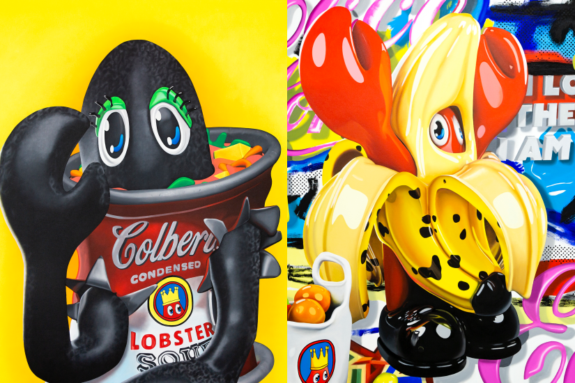 右:Philip Colbert《Collaboration Painting from the Lobster Land Museum (Lobster Banana)》(jjuju bju bu局部) 2022 Oil on canvas163 x 132 x 5 cm