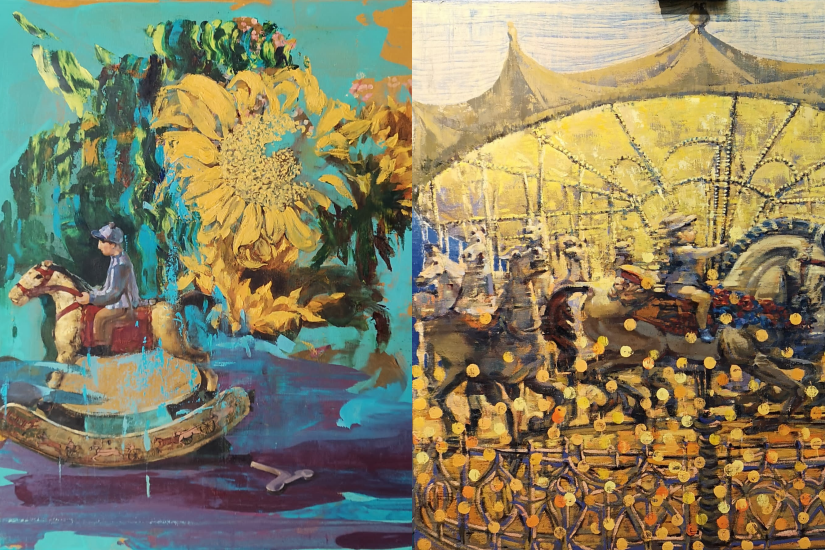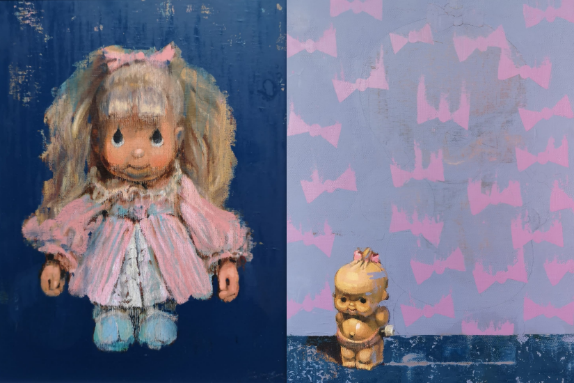 今次展覽中,她運用濃烈、對比的色彩,記錄她曾經無憂無慮的兒時光景:如《幸福時光》中,深淺黃色點點,一般女性溫馨明亮,凸顯旋轉木馬上孩童內心的歡樂;《娃娃》系列、《布虎》、《中秋》、《對岸》、《悠然》、《紅色的經典》,以孩童玩具為主體,構圖簡單,細膩畫工中洋溢充沛情感,讓人憶起兒時的美好時光。