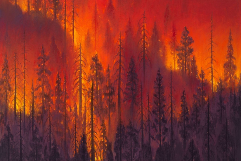 展覽同名作品系列「紅色森林」描繪了熊熊的森林大火,這是藝術家在充滿氣候危機的當下,對風景畫這一歷史經典題材的全新探索。此外,藝術家將《紫色暮光》 裏的概念,與我們在森林大火中所見的紫紅色天空聯繫起來,讓觀眾反思天地自然,以及我們與環境的關係。