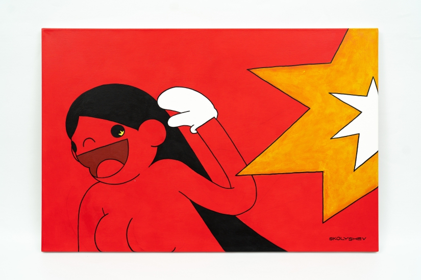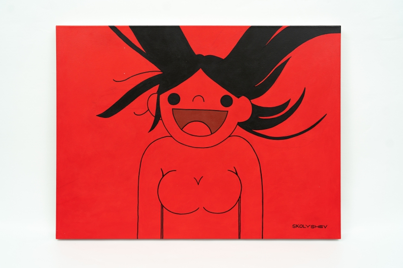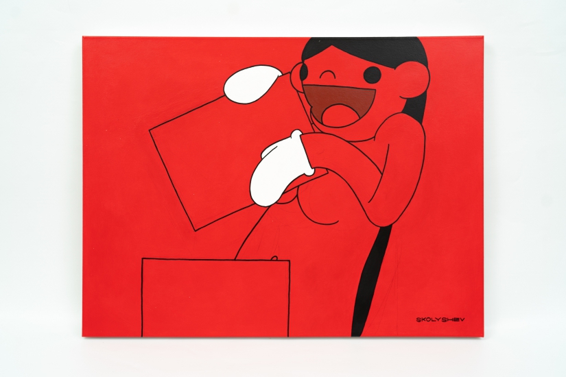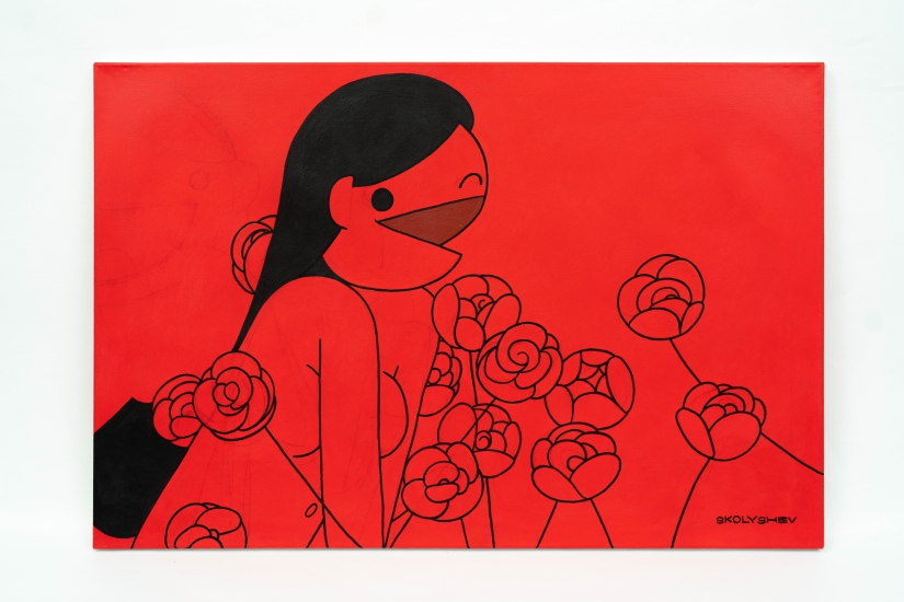 Skolyshev Vladimir(又稱 Sko1y)是自學成材的畫家,他的作品不見複雜的筆觸,反而以最簡約的線條與色彩直擊觀眾眼球。紅色經常予人暴烈、憤怒的印象,但藝術家將之轉化為光明、美麗的視覺語言,為每一位「紅色」女孩注入不同的情感,讓看似揚起「公式化」笑容的角色擁有獨特個性。這些女孩清一色披著一頭中分的黑長直髮,帶著白色手套,身份成謎,但其展現的赤誠與樂觀讓人神往。