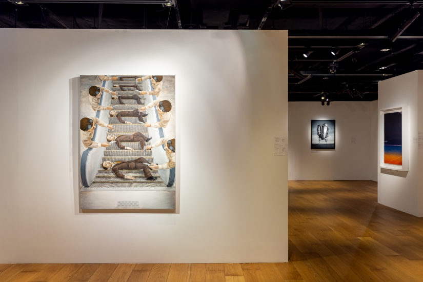 藝術品展示由石田徹也的《運輸帶上的男人》 領銜。這位日本藝術家在短短十年的藝術生涯裡只創作 了 217 幅畫作,引證其作品的珍貴程度。 此作展現了藝術家別具辨識度的卡夫卡式風格,深入探討日本泡沫經濟爆破後籠罩社會的灰暗陰霾,以及勞工階層的渺小。