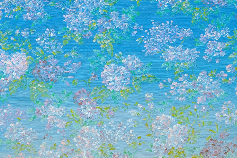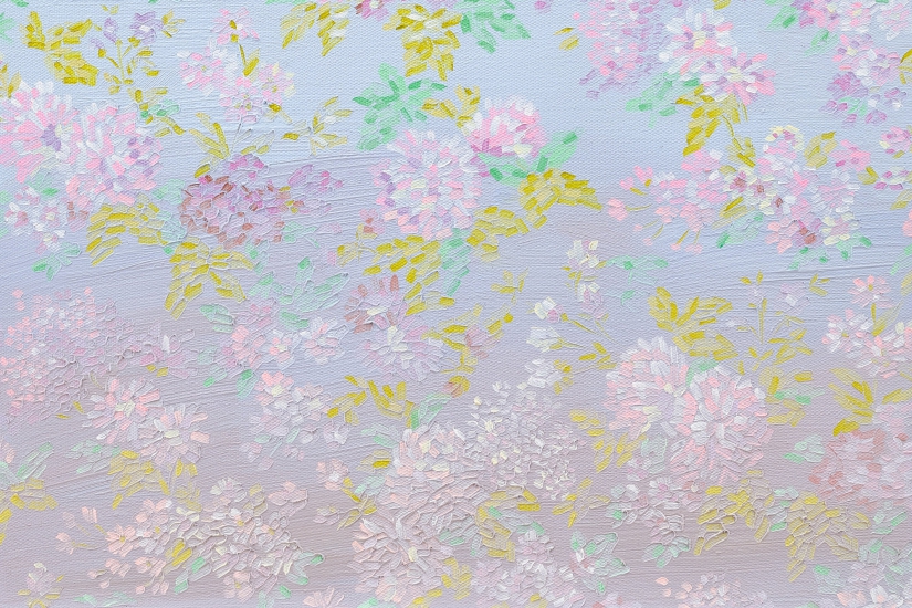 梁遠葦以複雜精細的花卉圖紋畫作見稱,《2015.07》與 《2015.10》展現了她高超純熟的繪畫技巧與繁複精細的創作概念。她在畫布逐層繪畫上色,與傳統壁畫的創作技巧相似,過程複雜繁瑣。完成後,作品表面仿似綢緞般帶有光澤,讓人聯想起女性不能抗拒的捲圈花呢連衣裙,在陽光之下同樣會若隱若現地閃爍。