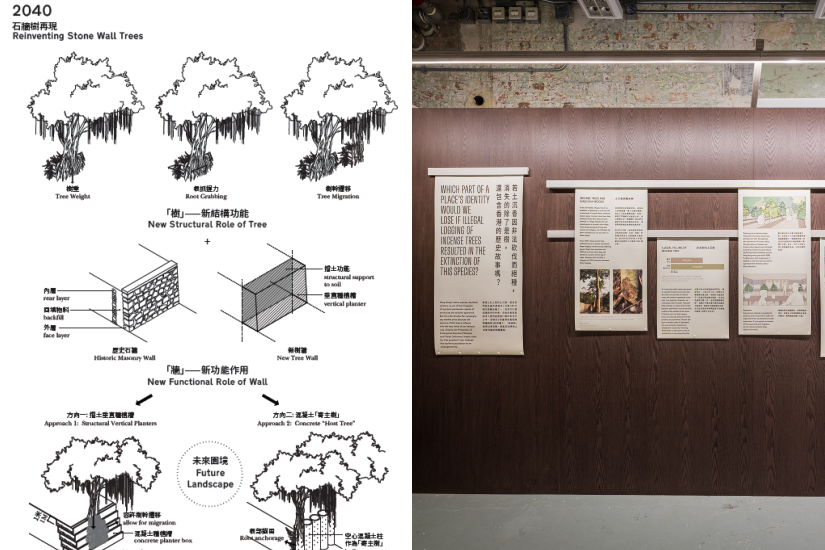 黃廷風帶來錄像及研究結果資訊圖 《香港石牆樹:成就垂直城市林務的遺蹟》 ,這個項目概述了自香港殖民時期以來石牆樹的發展時間表,還通過更全面的解讀來解 決目前狀況,以便為所有持份者提供一系列設計選項,以考慮我們未來的城市景觀。