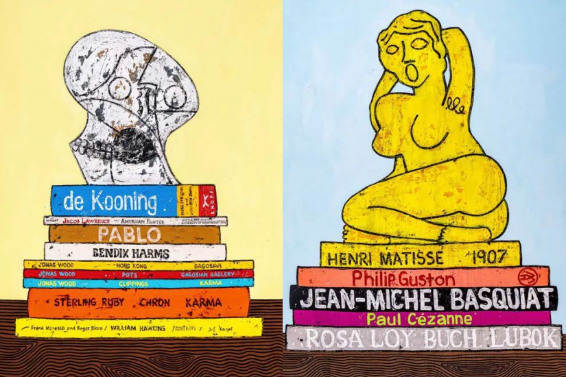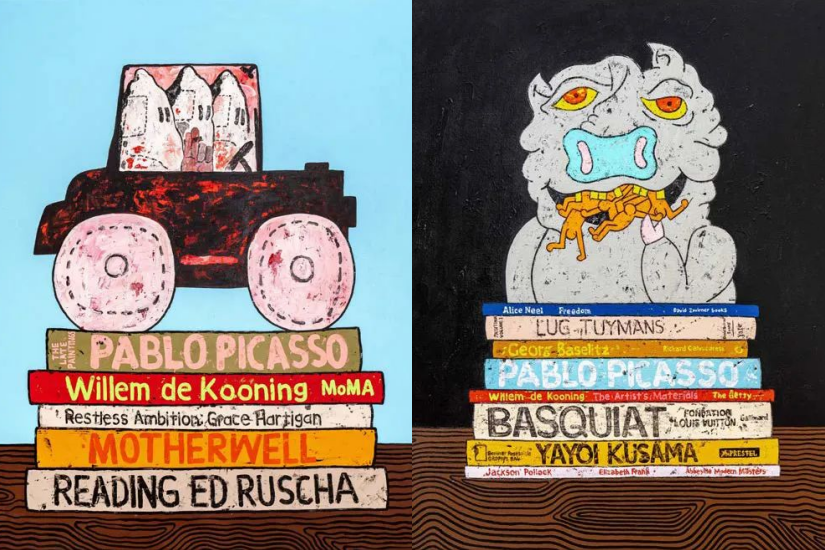 右:《Still Life with Keith Haring Sculpture on Art Books》,2022,布面丙烯,111.8×101.6cm