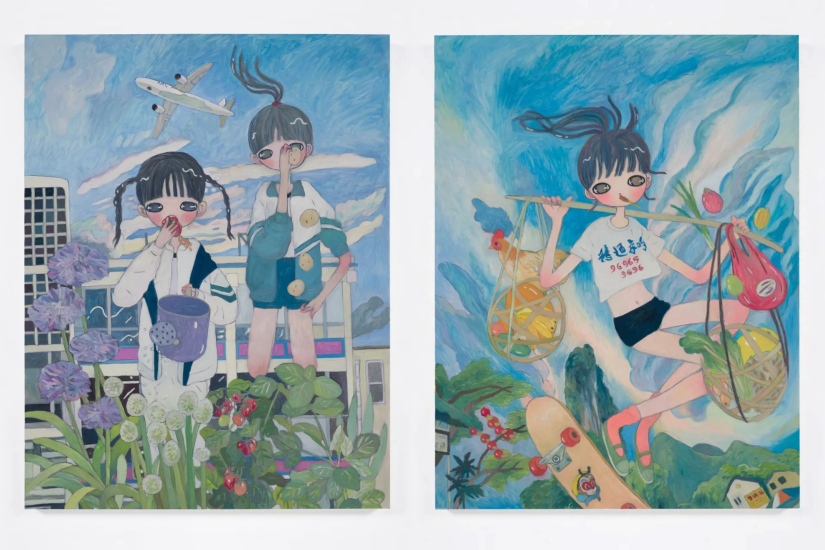 左:《我們劃出了一片天地..》, 2022. 布面油畫. 145.5×112cm. ©2022 Aya Takano/Kaikai Kiki Co., Ltd. AllRights Reserved. 圖片提供:藝術家與貝浩登;右:《在桂林》 2022. 布面油畫. 145.5×112cm. ©2022 Aya Takano/Kaikai Kiki Co., Ltd. All Rights Reserved. 圖片提供:藝術家與貝浩登