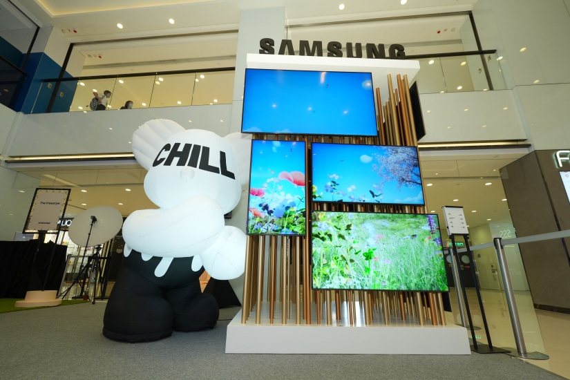 場内另一焦點 —《Frame Your Love》藝術收藏系列,是 Jibin Im 首個同步以數碼及實體形式創作的藝術項目。創作靈感源自 Samsung The Frame 五款可自訂顏色的電視邊框,製作成同色系的抱抱熊藝術收藏,包括:淺木色、胡桃色、自然粉、檸檬黃及純潔白。同時,將實體抱抱熊公仔帶到數碼世界,以技術屏幕呈現藝術細節。