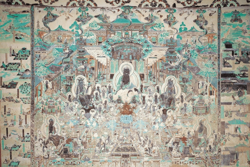 今次展出藏品相當豐富,其中包括《觀無量壽經變圖》。莫高窟第 172 窟南壁的正是以 《佛說觀無量壽經》來畫,當中描繪了阿彌陀佛的西方莊嚴淨土,其中樓閣由寶石做成,下有金沙鋪底的七寶池,加上被音樂與散花包圍的環境,地上有孔雀、共命鳥的珍禽,描繪了一幅虔誠信徒登上一片恬靜神聖的淨土。