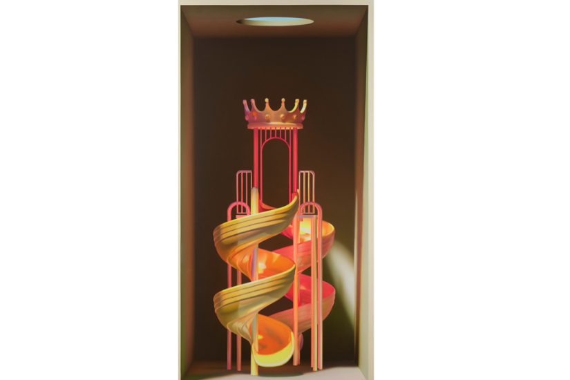 在今次香港展覽中,Ghadyanloo 透過畫作探索二元性的主題,例如在《平行的愛》(2022)中,兩條滑梯於空間中迴旋,相互映照。《國王的演說》(2022)上方的王冠,將社會階級的符號變成兒戲之物。