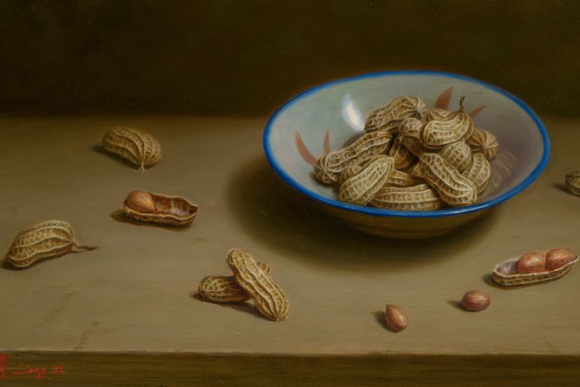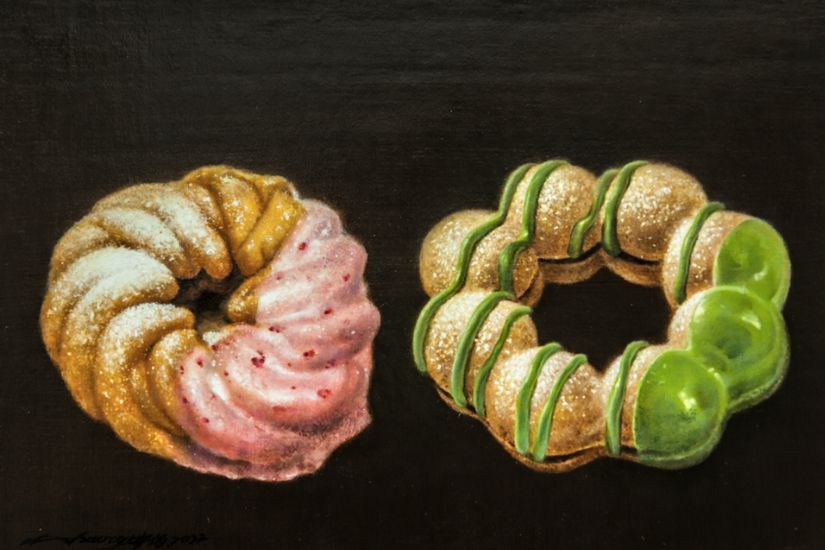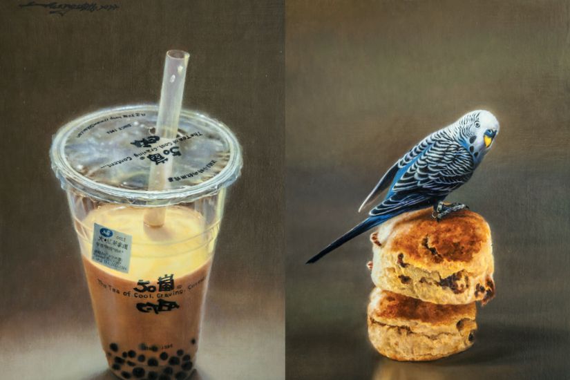 藝術家黃坤伯創作運用西方古典油畫技法,寫實地呈現物件靜置的狀態。而明亮的顏色及光影對比強烈,讓食物添加幾分超現實美感。畫家筆下細膩處理質感和肌理,同時捕捉當下的一種寧靜的氛圍,把食物的唯美表現到極致。他今次帶來了為香港人所熱愛的台灣小食—甜甜圈和珍珠奶茶。