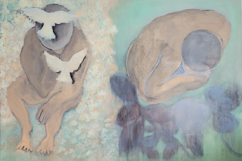Winnie 許穎的《Soul Painting》系列有 4 件壓克力布本和油畫作品,靈感均源自她的宗教信仰。對她而言,藝術爲審視其個人身份、地位和性格的起點。這個系列的畫作猶如鋪上一層薄紗,柔和的弧綫和淡淡的筆觸,讓畫面隱約透着模糊朦朧美的氛圍。這種虛無縹緲的感覺令人不禁駐足思考作品背後的意義,觸發個人反思之餘,也讓觀衆得到心靈上的慰藉。她的作品演繹出藝術家和觀衆渴望從大自然、社區以及家庭中得到的救贖,詩意盎然。