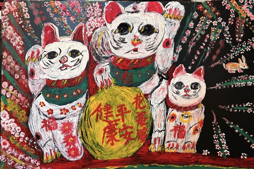今次花婆婆的個人展覽「與花共舞」共展出逾 30 幅作品,為配合新春主題,她以招財貓、肖像、動物和最高辨認度的花花作為創作主軸,展示出率性又趣緻的繪畫功架,也讓大家沉浸在其洋溢喜慶氣息的作品中。