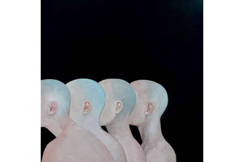 對李欣儀而言,人只是場景中的一部分。她執意選擇將人的五官留白, 僅用純白色的輪廓表達肢體動作。她巧妙地運用壓克力顔料的透明特性,以不同的暈染層次突顯物件的主次。沒有臉龐的人類,象徵了人類的卑微,空白裏隱隱透着莊子所提倡的「齊物」概念——物無大小。