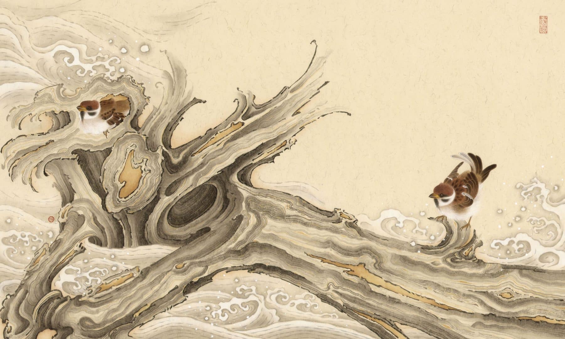 除了山水,花鳥是中國水墨畫的另一傳統題材。 這部份的藝術家受自然界萬物的柔韌與美麗,以及人性的美德與自然的法則所啟發,以全新的構圖方式創作花鳥和蝴蝶的水墨畫。藝術家包括儲楚、李君毅、張藝蓉的作品以素色背景襯托出鮮花,強調花朵隠藏着的極致嬌嫩。