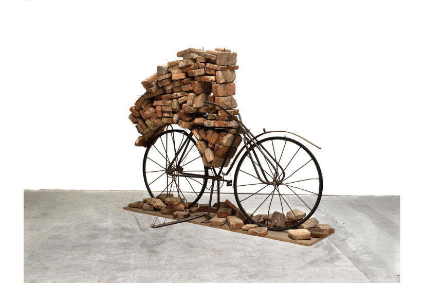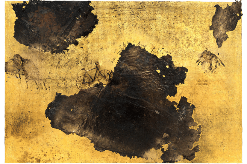 他的作品取材自層層疊疊的原始材料,包括金箔、鉛、油、丙烯酸、土壤和沈積物等,持續創新素材以及主題選擇。在今次展覽中反復出現的主題還有自行車和車輪,寓意文藝復興和周期性變化從此到彼的意念。