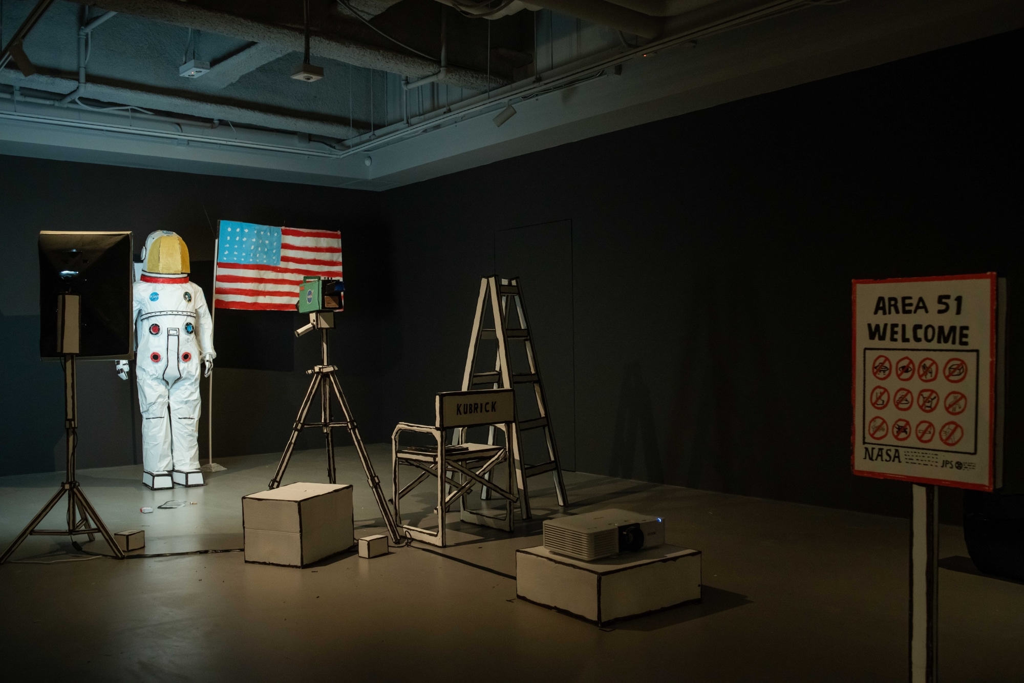 藝術家 Barminski 以紙板雕塑藝術為人熟悉,在這場展覽中,他透過紙板玩具店模式呈現的裝置作品展,其所表達的是,也許眼前看似是充滿童真的夢天地,背後其實隱藏了諷刺登月計劃的陰謀論,糖衣包裹的是讓人看不見的現實世界。