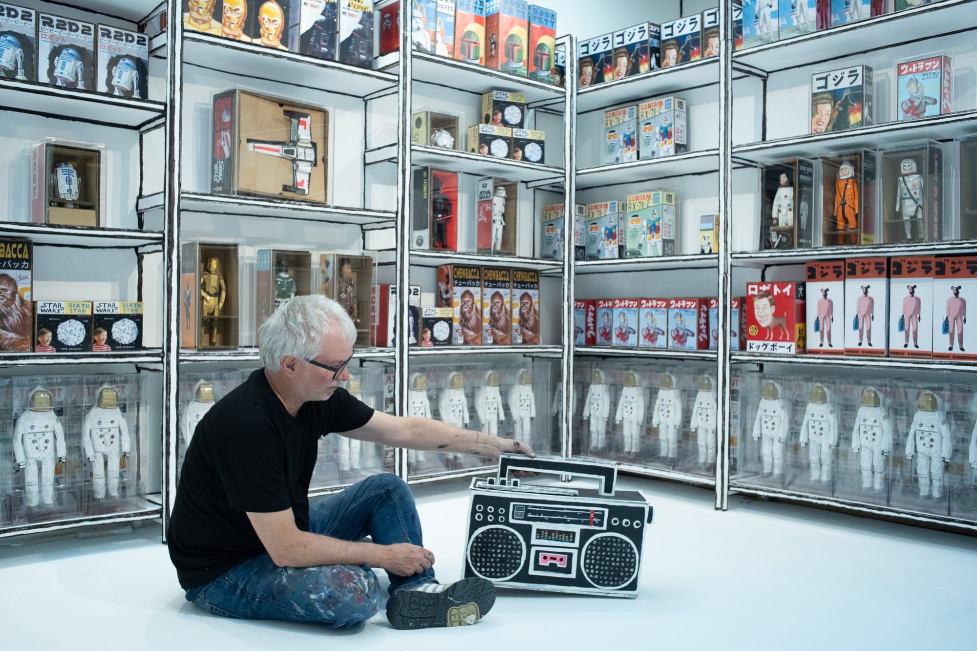 今年是香港 JPS 畫廊開業10 的週年,畫廊為此特別舉行連串活動,特別邀請美國藝術家 Barminski 參展,並帶來首部曲「Moon Lands On Man」展覽。展覽以沉浸式的紙板玩具店揭開序幕,眼前看似充滿童真的夢幻國度,背後卻隱藏着諷刺登月計劃的陰謀論。糖衣裹住的是讓人看不見的現實世界。