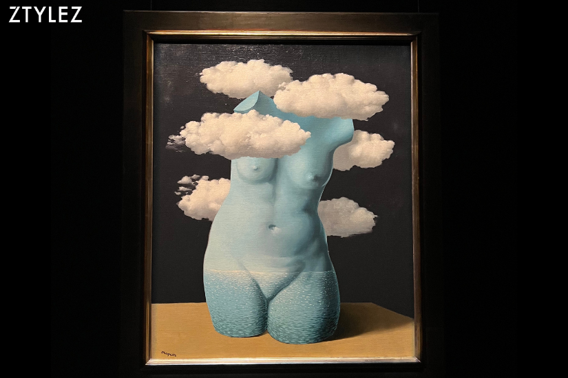 同場的,還有超現實主義大師馬格利特(René Magritte)的《Torse nu dans les nuages 雲中裸體》(約1937年)。這是 René Magritte 的重要之作,呈現了其標誌性的創作元素:一個置於工作室檯面上的裸體女性軀幹,背景是黑色布幕,猶如劇院舞台;蔚藍的天空和海洋與浮雲交織,投射在年輕女性的身軀上。作品融合了現實生活、古典雕塑和解剖學元素,將日常景象轉化為超現實的夢境,探究迷人與讓人驚恐的事物之間的微妙界限。