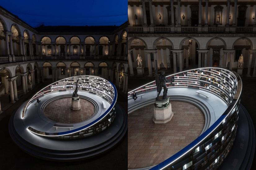 In the ancient courtyard of the historic Brera Art Gallery, the acclaimed British artist Es Devlin created a rotating 《Library of Light》 (Library of Light), unveiling a captivating prelude to the 2025 Milan Design Week.