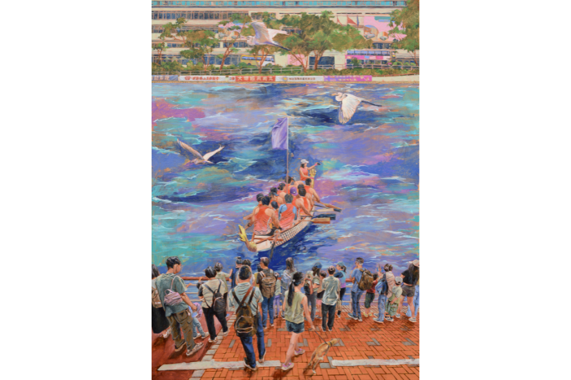 周俊輝的《沙田龍舟競賽》(2025 年)透過塑膠彩在布本上展現熱鬧的城門河景,畫中融入動物與人類共存的細節:白鷺隨鼓聲翱翔,魚兒穿梭水間,龍舟競渡的威猛氣勢更成為視覺焦點;岸邊聚集的群眾與奔跑的寵物,描繪了城市生活與自然環境的交響曲。周俊輝以獨特視角捕捉這些瞬間,呈現出一幅充滿活力與共生哲學的藝術作品。