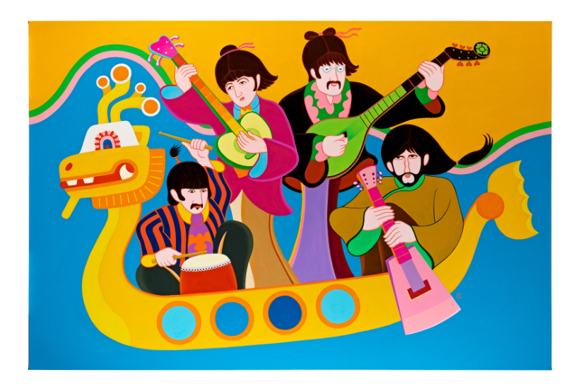 石家豪的《黄龍舢舨》將西方搖滾與中國民間風俗融為一體,創造出一種超現實的視覺體驗 —— 他說這幅作品是受到披頭四的啟發,尤其是 1964 年樂隊訪港及 1977 年約翰 · 藍儂帶兒子參觀虎豹別墅的歷史片段。「我兒童至少年時代,披頭四的歌曲仍然相當流行。我讀大學時終於在電影院看過披頭四的黄色潛艇動畫,被其音樂與畫面深深震撼。 1990 年代雷射唱片普及後,我陸陸續續聽遍披頭四所有出版過的大碟。隨着年紀漸長,對披頭四的青春與創意越加沉迷。」