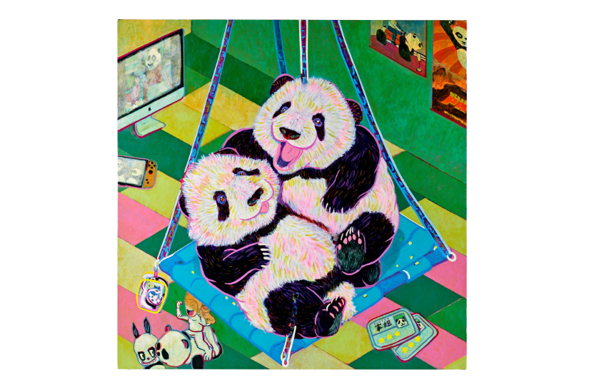 「而大熊貓的可愛造型,一向是流行文化的常客。就如是次 《@N1MALX:非人生活》展覽跨界別作品並置的展示方式,畫中亦將我們熟悉的流行文化作品,借來為家姐細佬的房間裝飾一番。」 —— 謝炎安