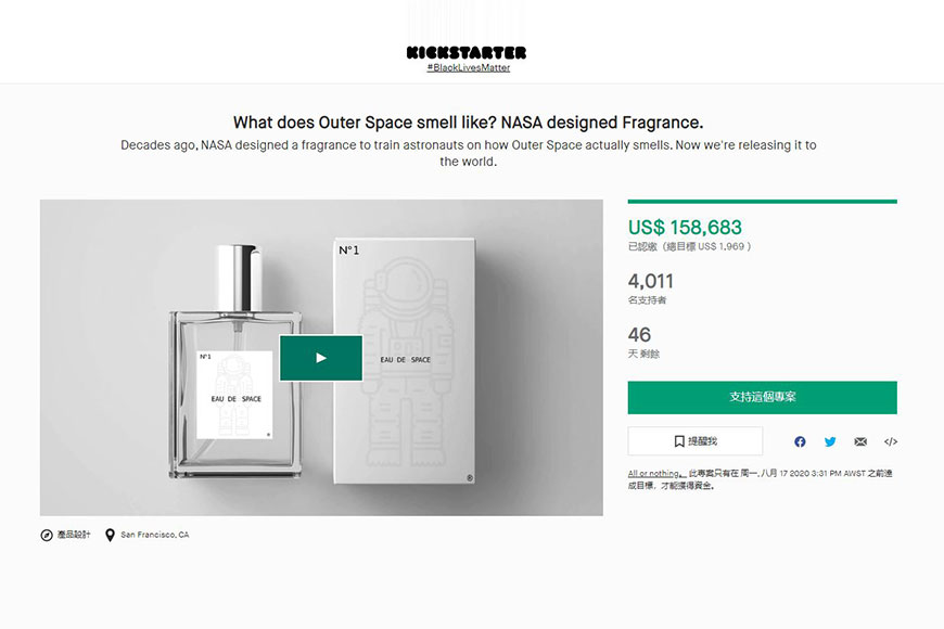 如此獨特的太空味香水,令太空迷及香水味都相當興奮,目前為止,已眾籌金額已超過 15萬美金,得到近 4 千人支持,預計將會在今年 10 月正式推出!而有消息指,NASA 下一步將會推出「月球」味道的香水,希望未來大家有更多機會,透過嗅覺「漫遊外太空」!
