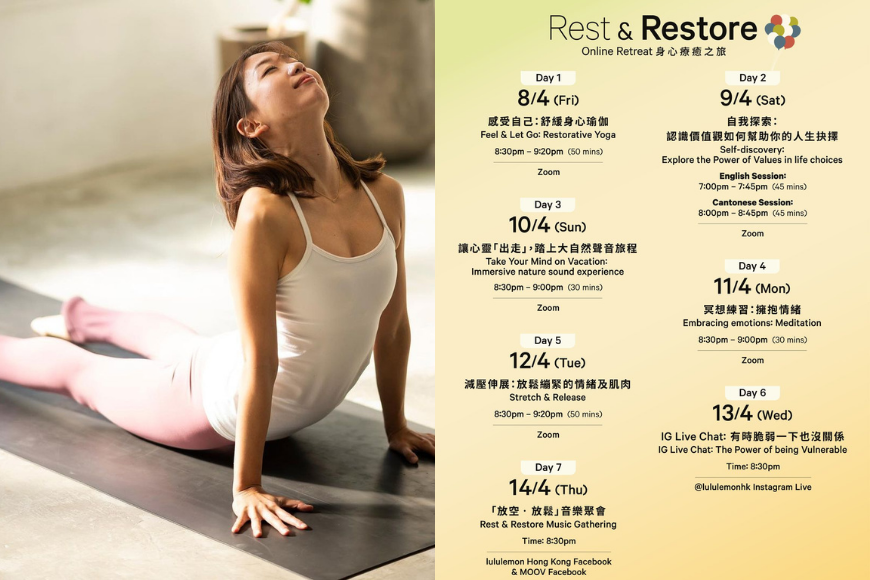 疫情生活持續兩年多,重複又重複的第 N 波疫情,香港困獸鬥式生活,無時無刻摧殘著大家的身心。由當初的精神緊張到如今的抗疫疲勞,都市人在後疫情年代都經歷太多,對目前生活感到乏力了嗎? lululemon 在明天 4 月 8 日開始,將舉行一連七日的療癒系線上活動「Rest & Restore 身心療癒之旅」,透過不同嘉賓分享讓大家一同舒緩疫情壓力。