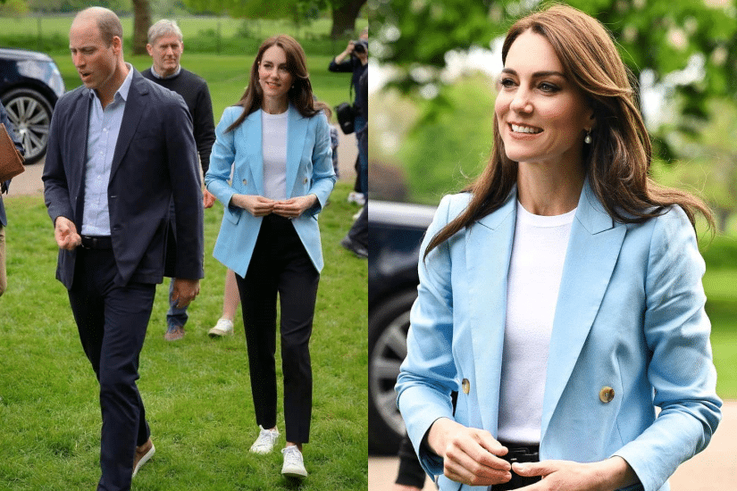 在加冕典禮後舉行的慶祝演唱會,Kate Middleton 與威廉至子一起在溫莎堡前與民眾會面及互動,Kate Middleton,選穿了 Resis 天藍色西裝外套搭配白 Tee及黑色褲,腳上穿的是 Veja 白色 snaekers,一身輕便簡約的穿搭,符合自然親民的形象。