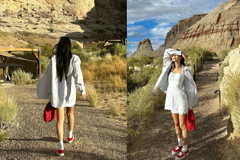 在展開度假的造型,Jennie 穿上 Reformation 白色連身短裙,外搭 Glowny 白色外套,腳上的紅色 Mary Jane 布鞋以及小手袋均是來自 CDG,一身打扮充滿青春少女氣息。