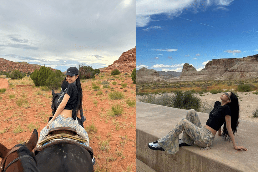 Jennie 在享受騎馬活動時,身穿黑色 crop tee 與 Acne Studios 印花長裙,加上 adidas 帽子與 Gentle Monster 太陽眼鏡,腳上的運動鞋來自 adidas 與 YEEZY 的聯名系列,簡便舒適的裝扮卻不失潮流氣息!