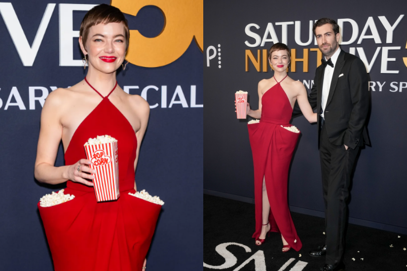 觀賞具娛樂性的電視綜藝節目,當然要邊看、邊吃著零食,才夠輕鬆愉快。女星 Emma Stone 為了呼應《Saturday Night Live 週六夜現場》開播多年以來帶給大家的歡笑聲,就帶來了最佳示範,以一身「爆谷裝」亮相節目的 50 週年派對,搶鏡又充滿幽默感,成為紅地毯上的亮眼焦點。