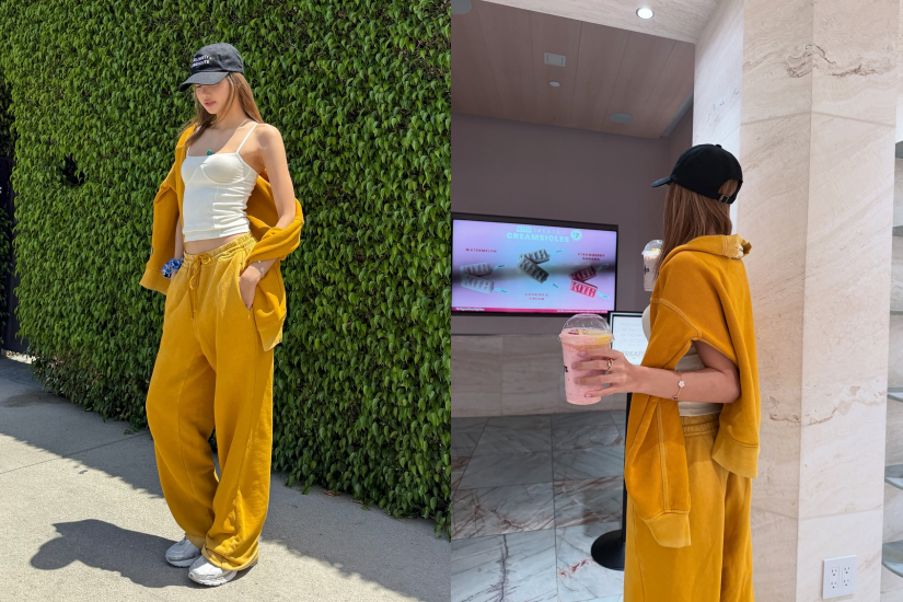 享受假期,想穿得舒適一點,又想不失造型感,運動套裝向來是不錯選擇。Lisa 穿起整套芥辣黃的運動套裝,內搭了一件白色吊帶背心,為 sporty look 加入一點辣度,休閒又具個人風格!