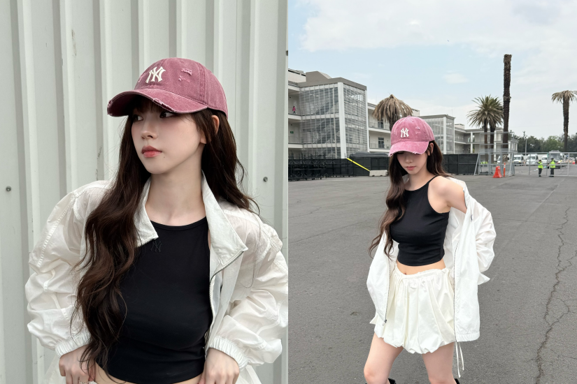 Aespa 成員 Karina 以粉紅色的棒球帽,搭配一身黑白色的短裙造型,顯得青春甜美又不失帥氣!