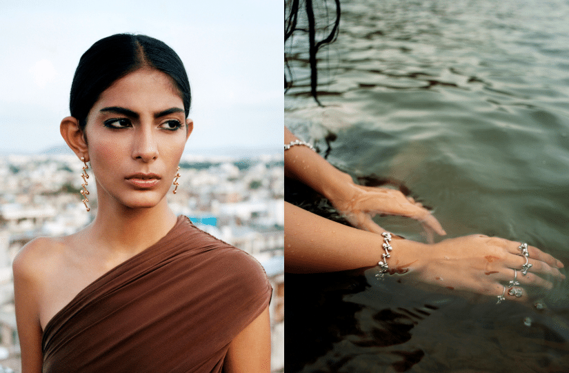 項錬由7顆共重46.09克拉的哥倫比亞圓形祖母綠寶石鑲嵌而成,幾何線條的運用帶出流轉及節奏感;耳環同樣以祖母綠寶石作主軸,耳托採用三角設計,鑲滿鑽石,閃耀但又不會搶去綠寶石的風采。