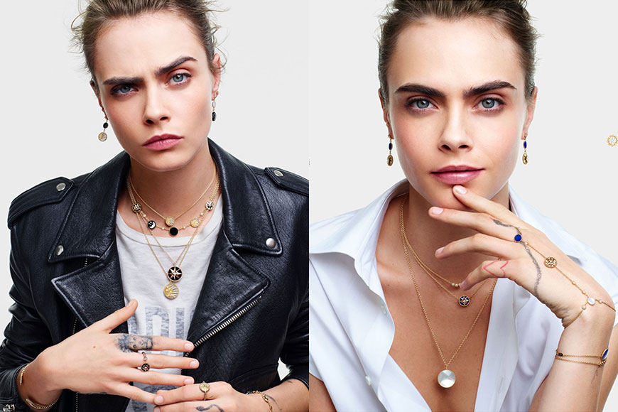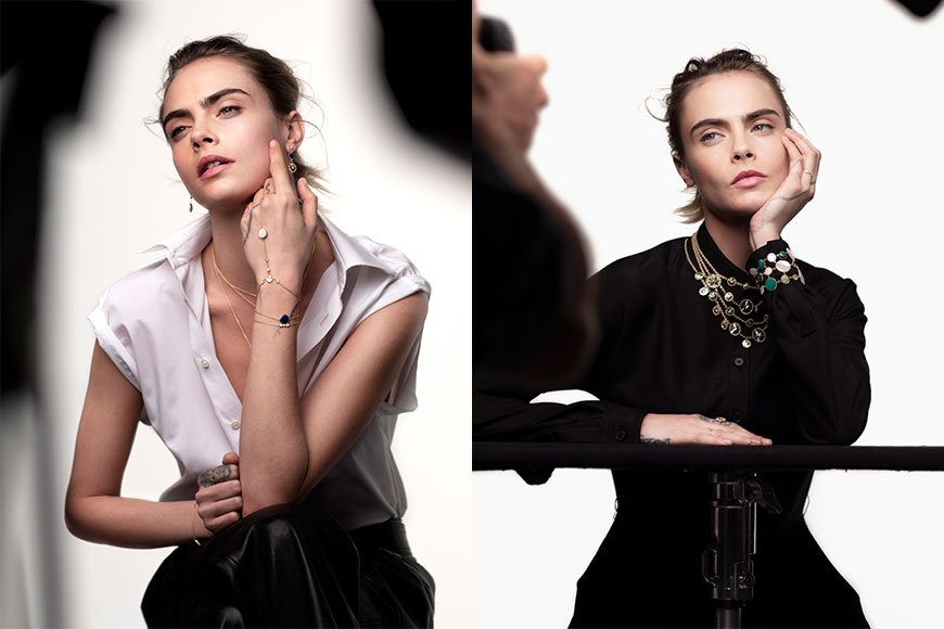 琢面精緻的 Rose Céleste 一面是黃金鏤刻耀眼的太陽,另一面則是月亮,與 Rose des vents 的八芒星互相輝映,以縞瑪瑙和珍珠母貝打造的黑白手鏈、耳環及頸鏈套裝,無論展示哪一面都散發嬉皮氣息,非常適合像 Cara Delevingne 這種不受傳統拘束、充滿個性與活力的年輕女性。