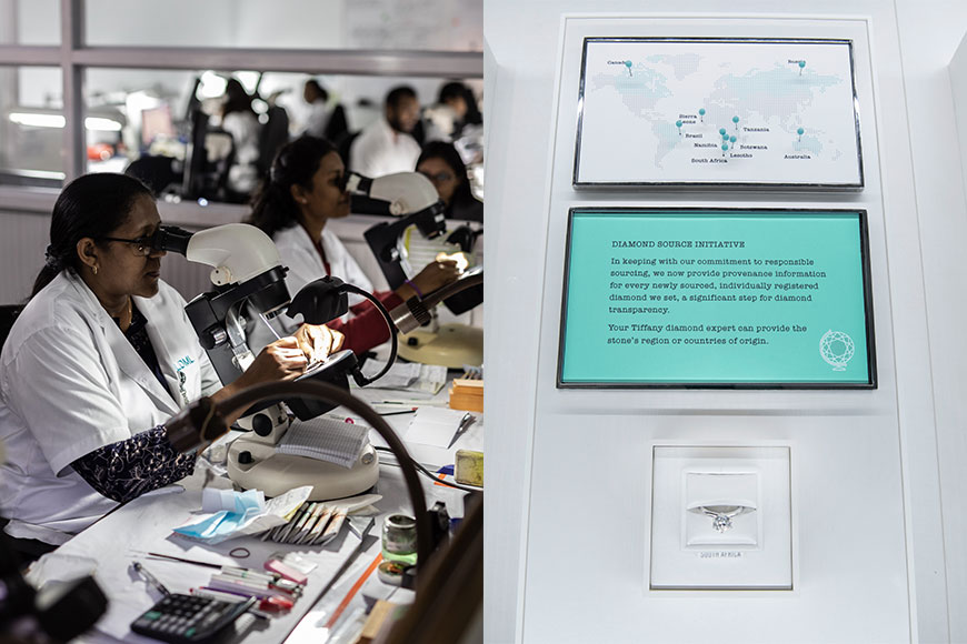 品牌會為每夥 0.18 克拉或以上、獨立註冊的鑽石整合資料。顧客可透過專業銷售顧問以及列印於 Tiffany 鑽石證書上,了解每顆鑽石的出產地、前期工序、切割、拋光、評級、品質保證和鑲嵌國家的資料。