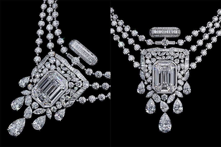 N°5 頂級珠寶系列中最矚目之作一定是 55.55 項鍊。外表呈 N°5 香水外型的項鍊,透過訂製方式形塑出 55.55 克拉寶石來表達香水的神髓。每顆鑽石以和諧的祖母綠形切割,完美呈現 D 色無瑕及具標誌性重量的 55.55 克拉鑽石,18K 白金檯座鑲嵌 104 顆圓形切割及 42 顆長階梯形切割鑽石。連珠寶創意工作室總監 Patrice Leguéreau 更形容「這是前所未有的手法」,可見品牌對這次設計非常重視,並展現出 CHANEL 在工藝上的大膽與卓見。
