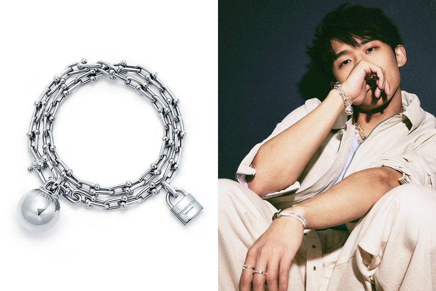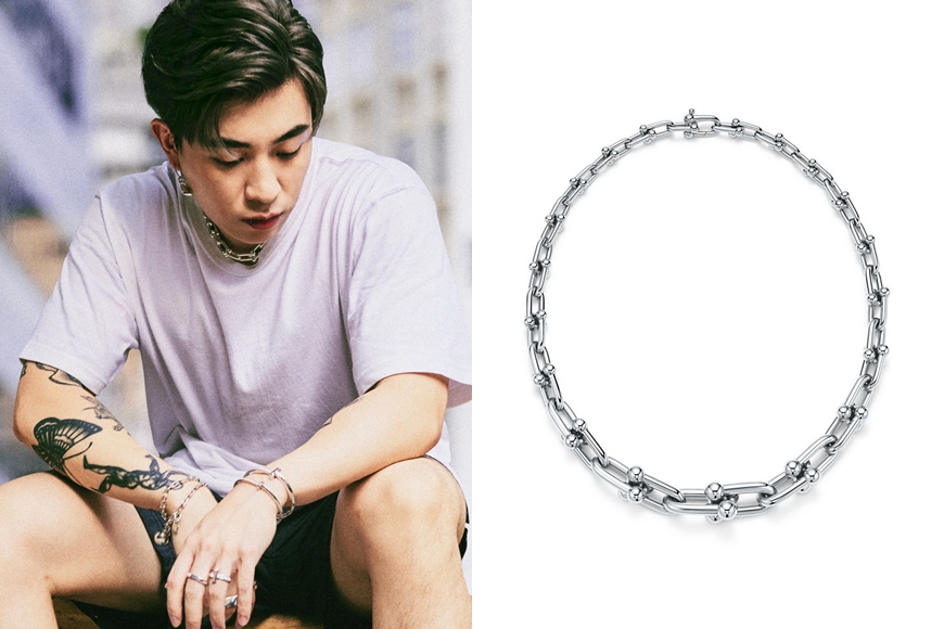 Ansonbean 與 Tyson Yoshi 佩戴上中性格調的 Tiffany T1 18K白金手鐲、指環及 HardWear系列頸鏈、手鏈,再混搭 Tiffany 1837™ Makers 系列指環,示範疊戴首飾的型格配搭方式,盡顯自由不羈風格。