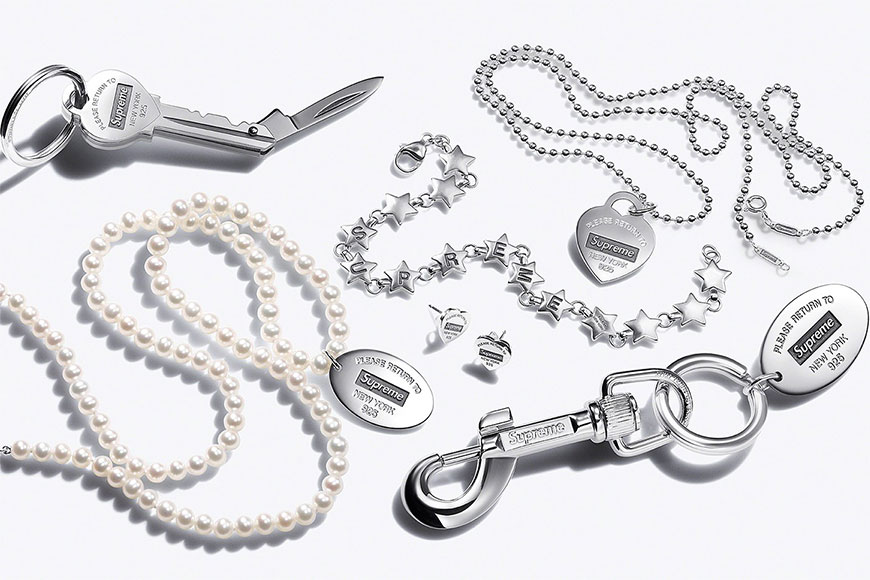 全系列飾品皆採用 925 純銀打造,並刻上 Supreme Logo。除了致敬意味濃厚的銀牌鑰匙圈外,鑰匙狀的摺疊小刀、心形銀牌項鍊、心形耳釘、刻有 Supreme 字樣的星形手鍊,亦處處流露出 Tiffany 的經典元素。