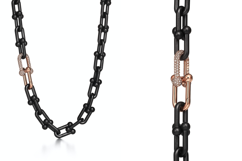 設計上,黑色鈦合金系列將同時推出手鏈及項鏈,並將以 4 月時推出的款式為藍本,為兩款精緻現飾配上以工業風造型打造的 18k 玫瑰金密鑲鑽石扣環,强調 Tiffany & Co. 所實驗的張力對比、比例與平衡,也為別具標誌性的 Tiffany HardWear 系列再創新猷。